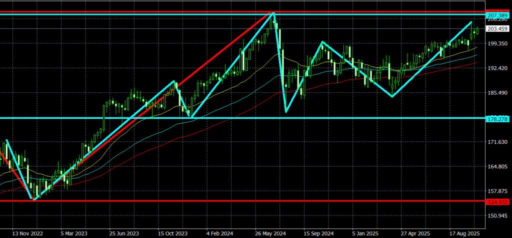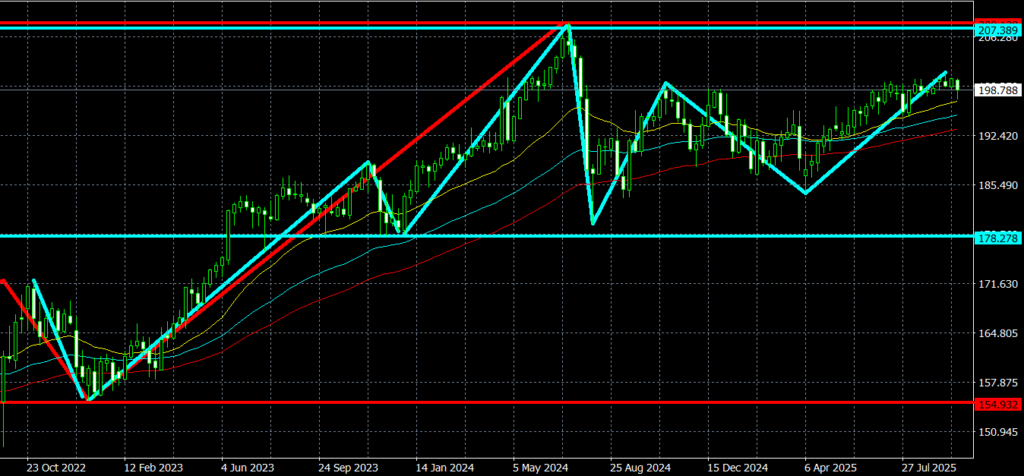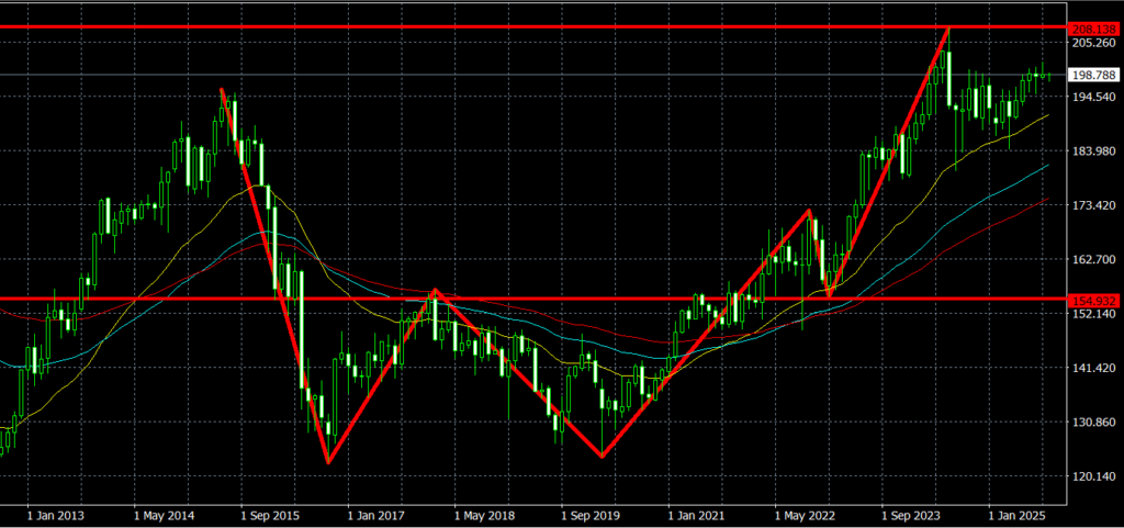 - 直近のローソク足は先々月が下ヒゲを付けた陰線、先月が上ヒゲを付けた陽線で、上昇の勢いは無し。