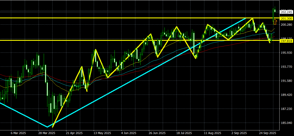 上昇トレンド中のレンジから、下落トレンド発生で下抜けするかと思いきや、日本の総理大臣決定によって大きく窓を空けて上昇。