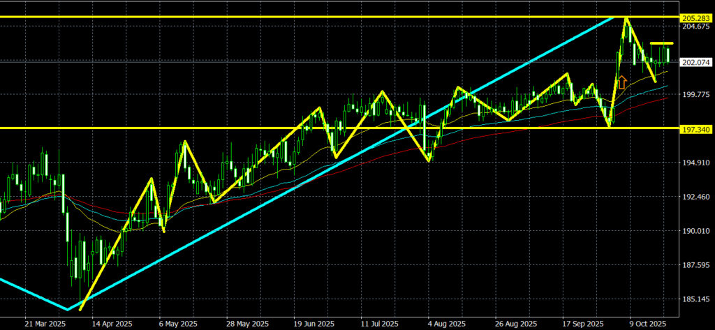 ロングポジションを保有しており、上の黄色水平ラインである高値を更新するようであれば、ロングポジションを追加狙う。