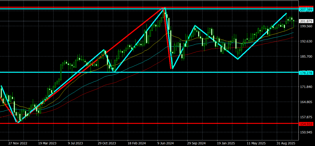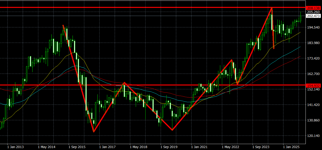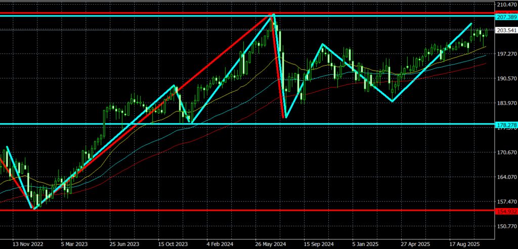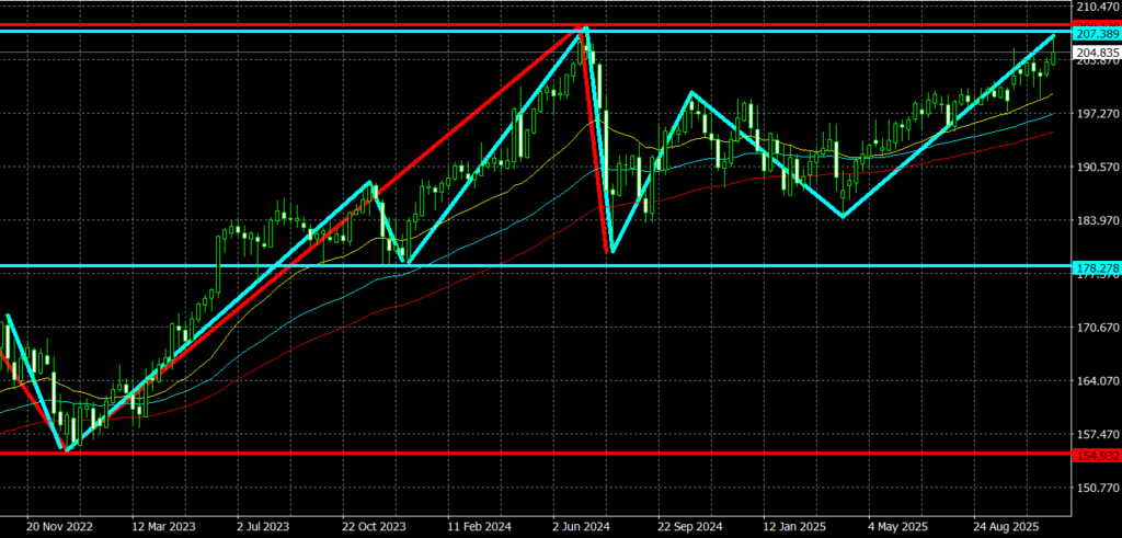 直近ローソク足は、上昇トレンドを形成しており、レンジ内下落トレンドの前回高値を上抜け確定。
