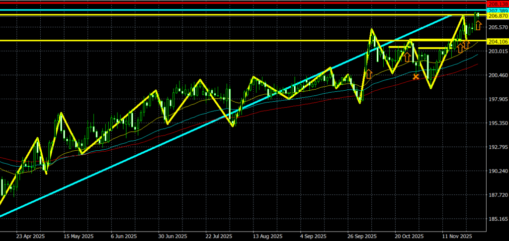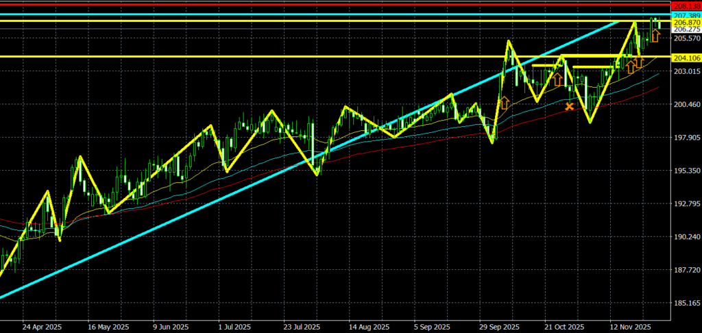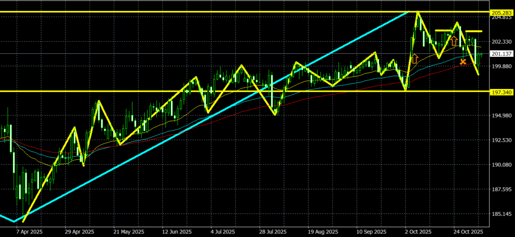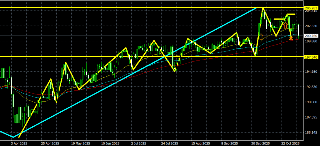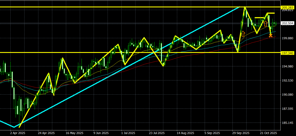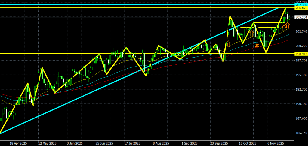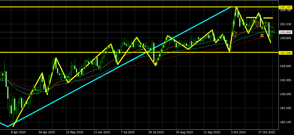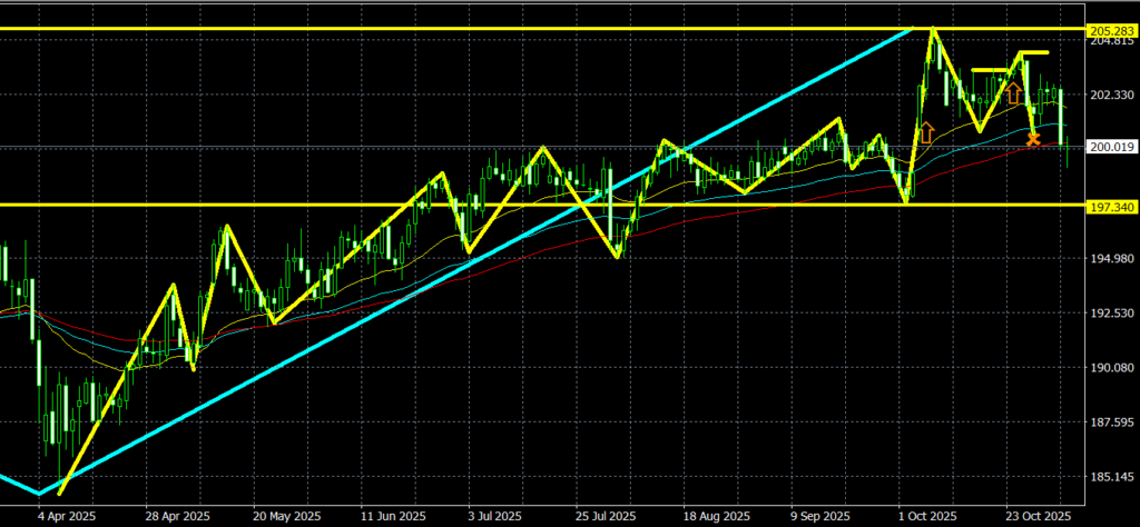 直近ローソク足は、押し目からの上昇トレンド発生で高値更新したものの、昨日と今日で高値安値を切り下げるローソク足が発生中。
