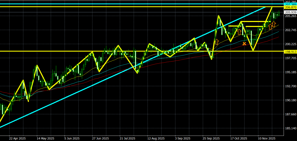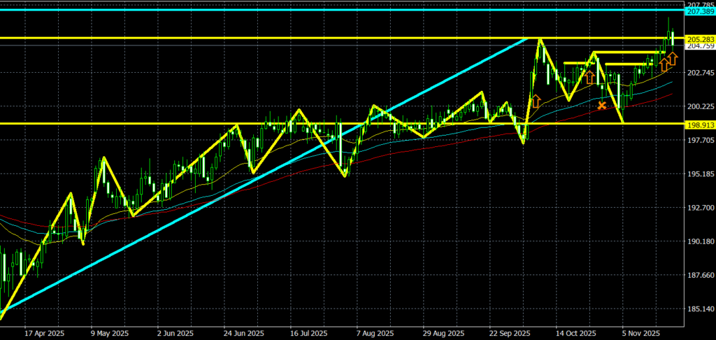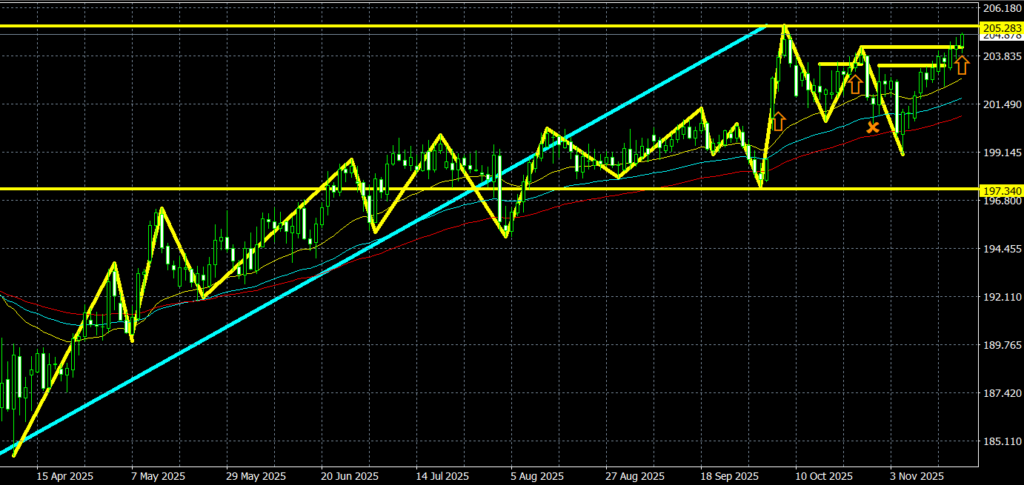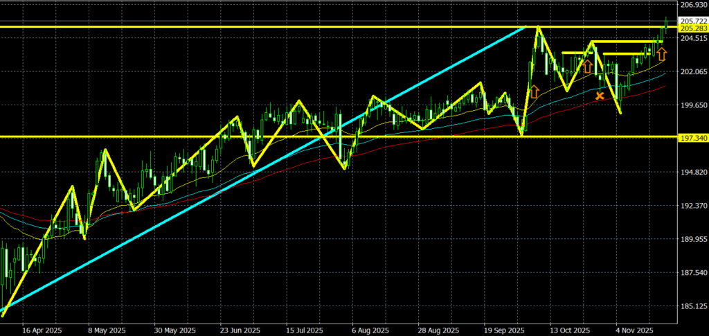 昨日のローソク足で、実体による高値更新を確定したため、安値を上に更新し、かつ、ロングポジションを追加。