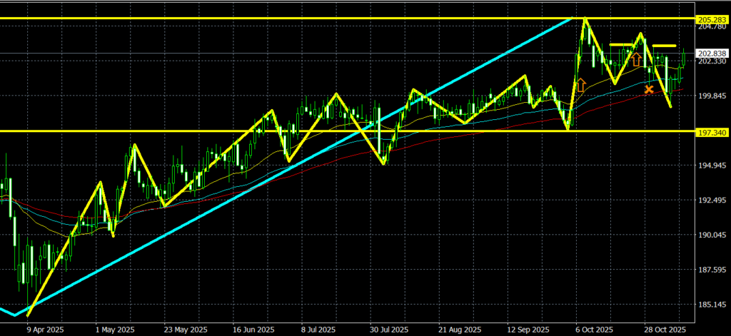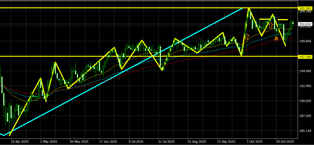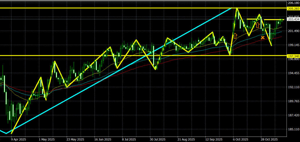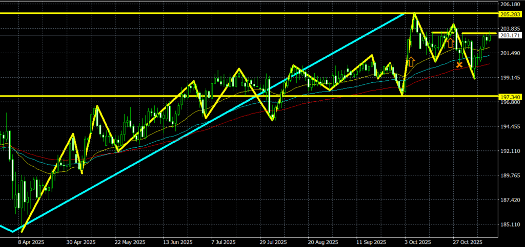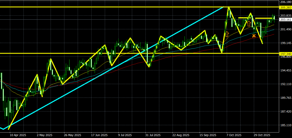黄色ラインは上抜けしてきているが、ロングポジションを追加するとしたら、レンジ内の下落トレンドの前回高値である上の黄色ラインを上抜けで行いたいところ。