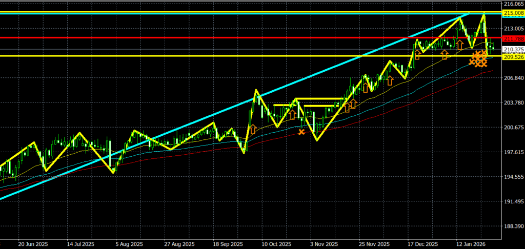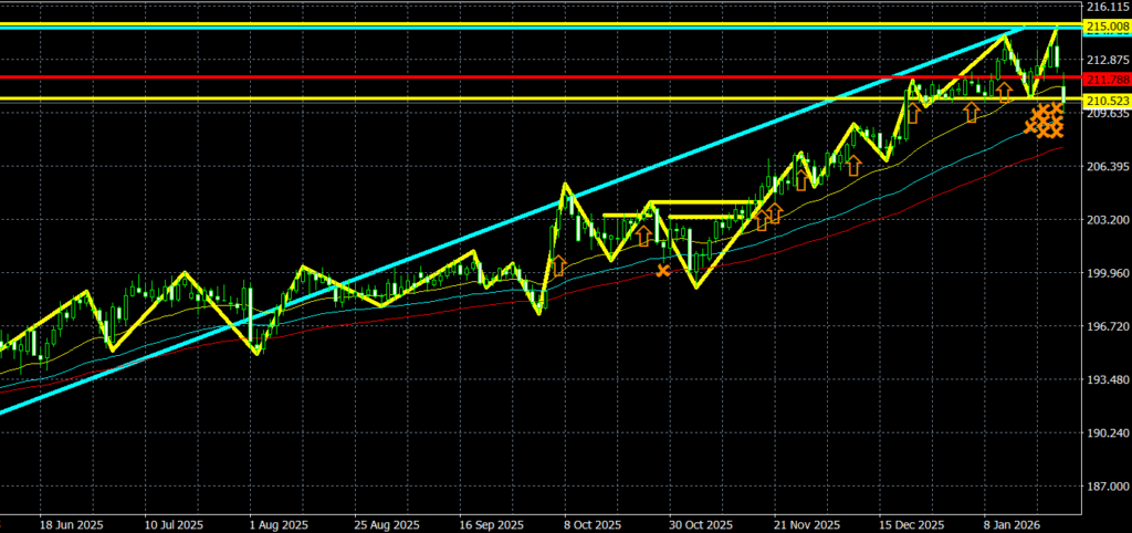 直近ローソク足の動きは、押し目下落からの上昇トレンド中だが、今日のローソク足は高値を更新しておらず、上昇の勢いは弱い感じ。