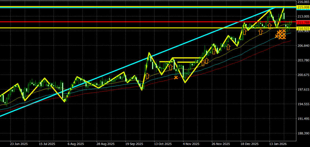 - 直近ローソク足の動きは、上昇トレンドの上昇波を形成中。