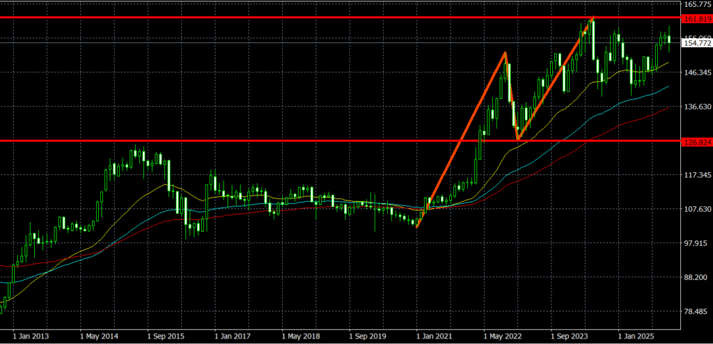 - 直近ローソク足の動きは、トライアングルの上昇波となるローソク足上昇トレンドを形成中。