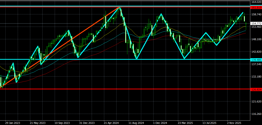 直近ローソク足の動きは、上昇トレンドが終了する大きな下落波からの戻り上昇に当たる、下落トレンド第2波を形成中。