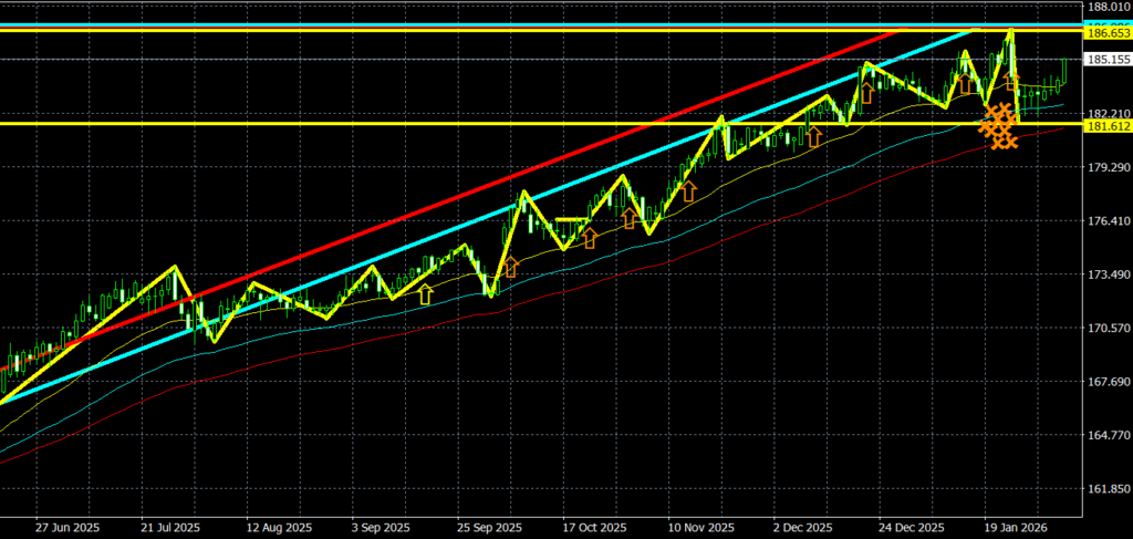 • 直近ローソク足の動きは、上昇トレンドの上昇波となるローソク足上昇トレンドを形成中。