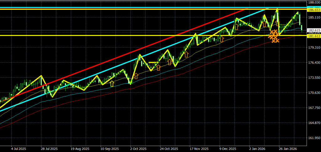 • 1月のローソク足は、12月ローソク足から高値安値を切り上げているものの、上ヒゲの大きな十字線(陰線)が確定しており、上昇の流れがいったん止まる可能性あり。