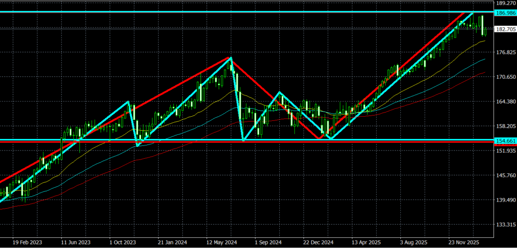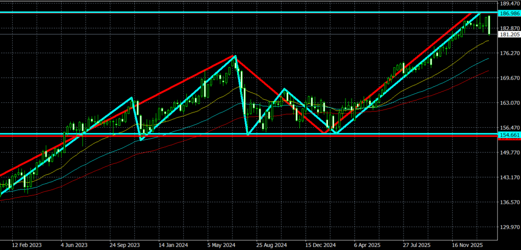 • 直近ローソク足の動きは、押し目下落となるローソク足下落トレンドが発生中。