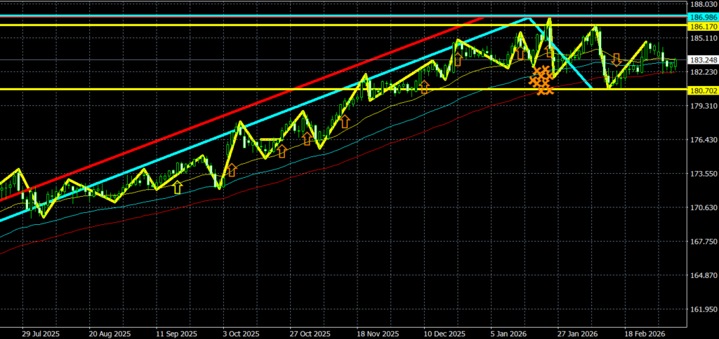 • 2月の月足は、陽線が確定しているものの、1月の高値は更新できず、高値安値を切り下げている状況。
