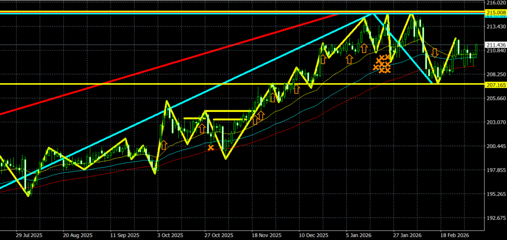 - 直近ローソク足の動きは、上昇トレンドの押し目を形成中。