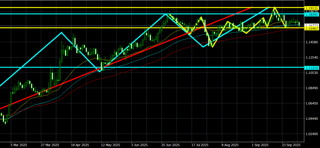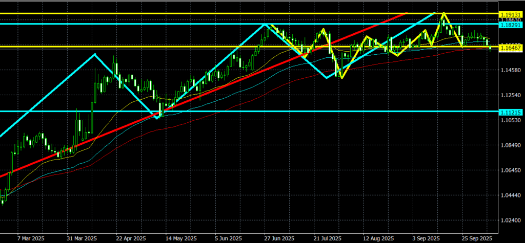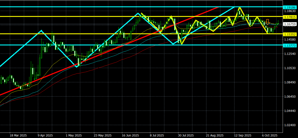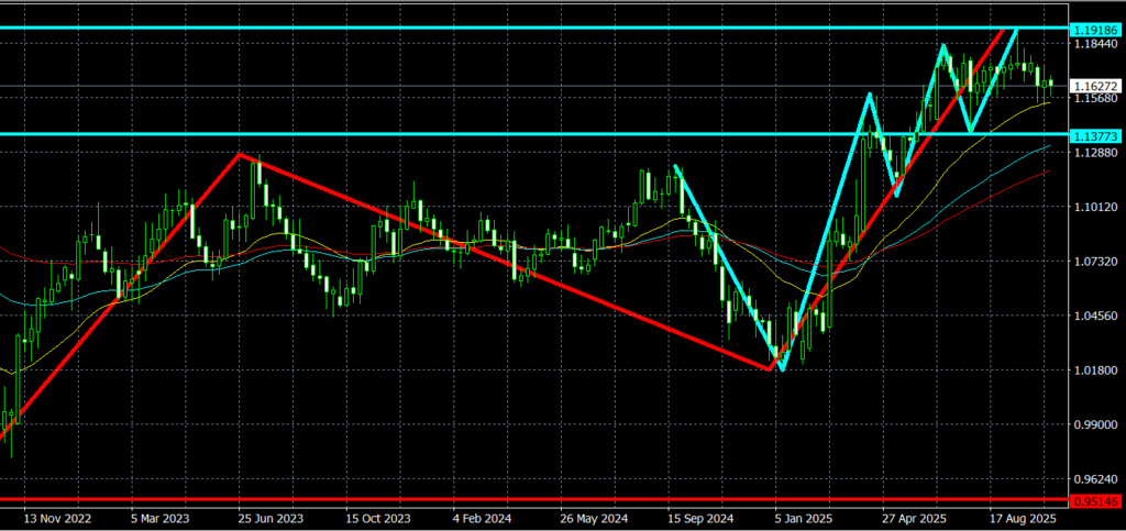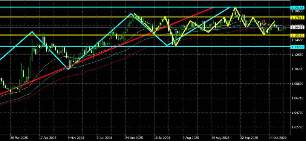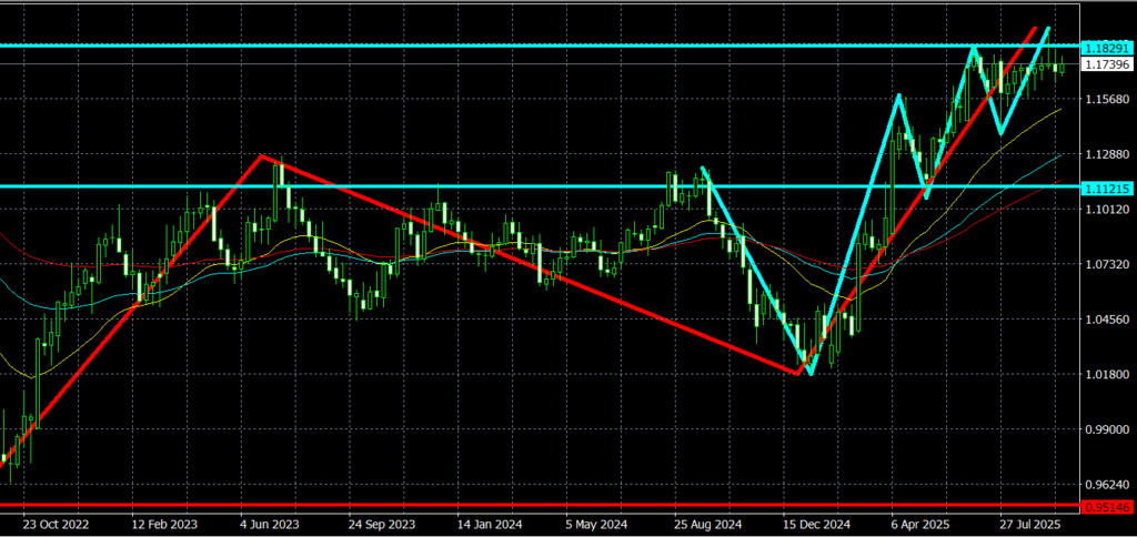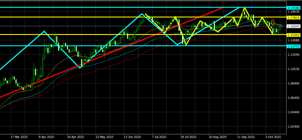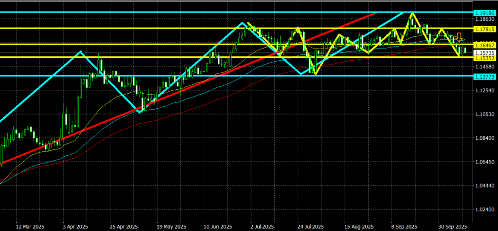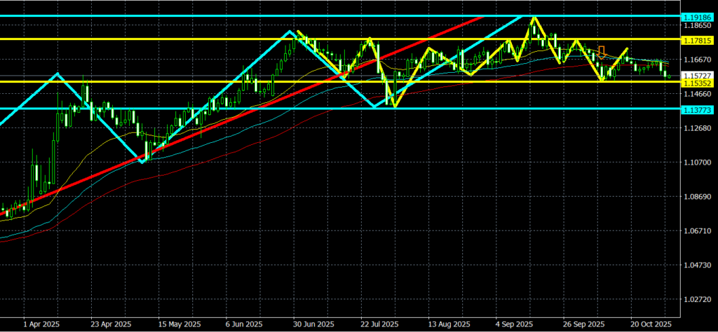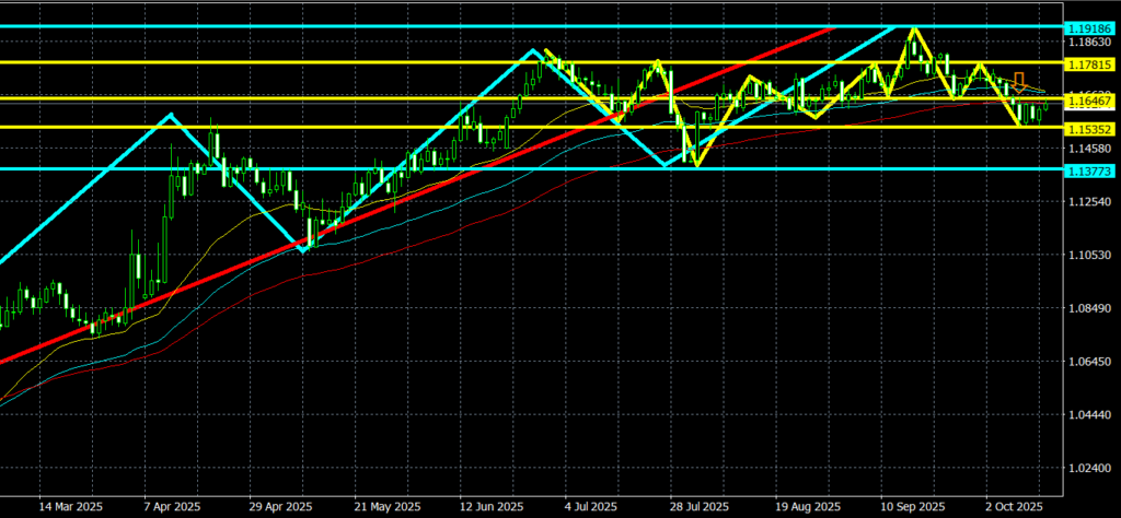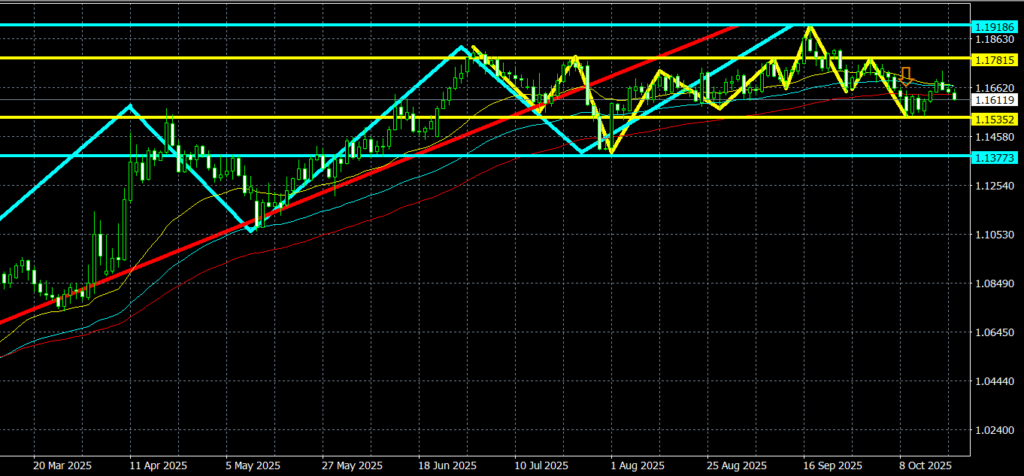 流れは上方向だが、週足も日足も上昇に勢いが無くなっている状況なため、レンジ下限の黄色ラインを下抜けしたら、ショートでエントリーするのもアリかも。