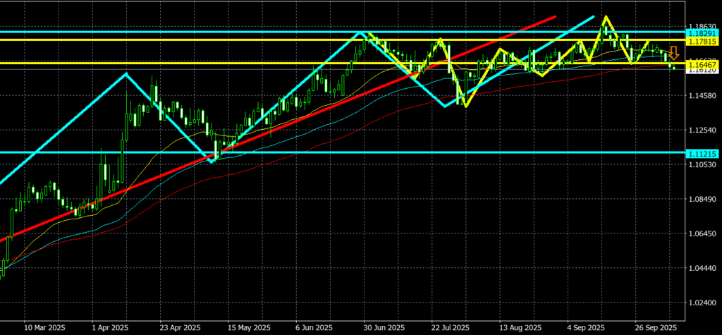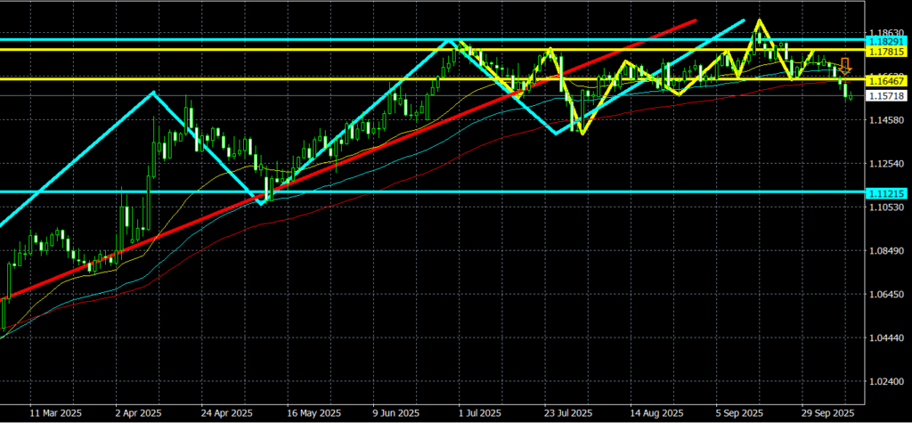 上昇トレンドのレンジ下限を下抜けて、下落方向に流れが転換中。